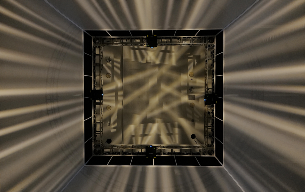 Light Architecture transforms exhibition space into an expansive canvas. The Neural Pods diffuse light across the space, forming a dynamic network that interacts with a central ceiling projection. This structure embodies a narrative of input and output. The visuals depict the fragmentation of human figures like scattered data pieces, followed by an explosion of light symbolizing singularity. The experience merges spatial sound, visuals, and light, enveloping the audience in an enigmatic black box that resists simple interpretation.